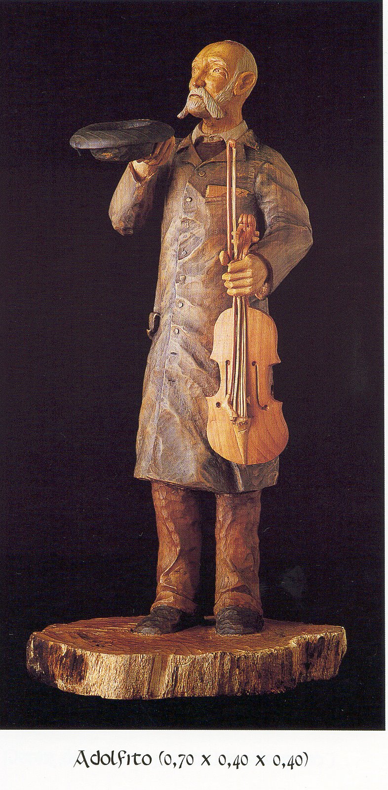 Sus tallas tocan diversos temas, como el festivo, con esculturas de bulto redondo que tienen un grado de crítica simpática en los personajes, por cierto muy bien proporcionados anatómicamente.